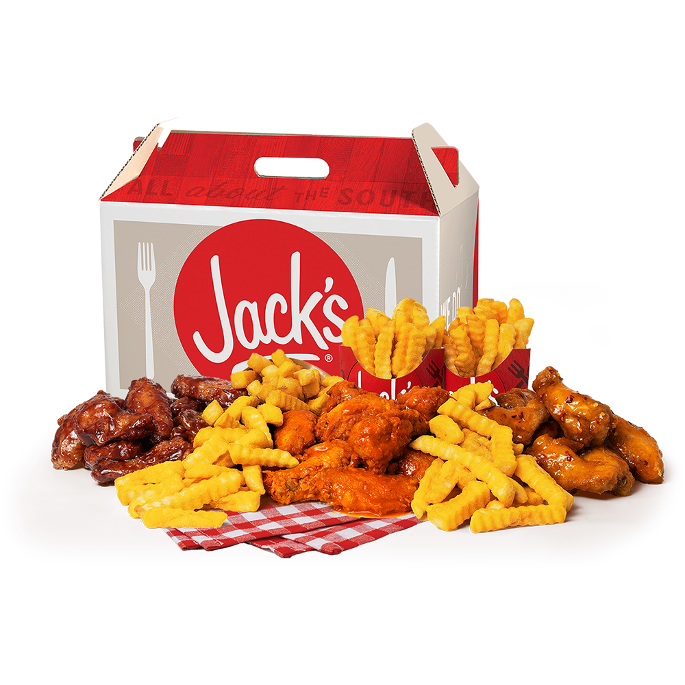 Feeding a crowd? Get thirty hand breaded, golden fried wings plain or slathered in your choice of Honey BBQ, Bold Buffalo, Sweet & Spicy or any combo of the four. All that plus crispy golden fries and homemade ranch.